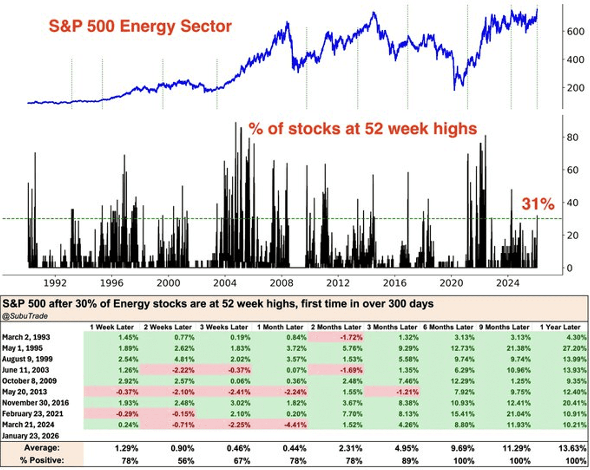 To finish on a positive note, energy has been the best performing sector this year, which sends a very bullish message for the market. The percentage of stocks in the energy sector that are at 52-week highs has risen above 31% for the first time in over 300 days. Why is that relevant? Historically, while the near-term results are mixed, the S&P 500 has been higher six, nine, and 12 months later every time this occurred. The reasoning for the rebound in the sector has varied over time, but the message has been the same. This is also consistent with the performance shift from growth to value and economically sensitive sectors and stocks. A positive return for January, more rate cuts ahead, broadening earnings growth, and energy sector outperformance all suggest that the bull market will continue.