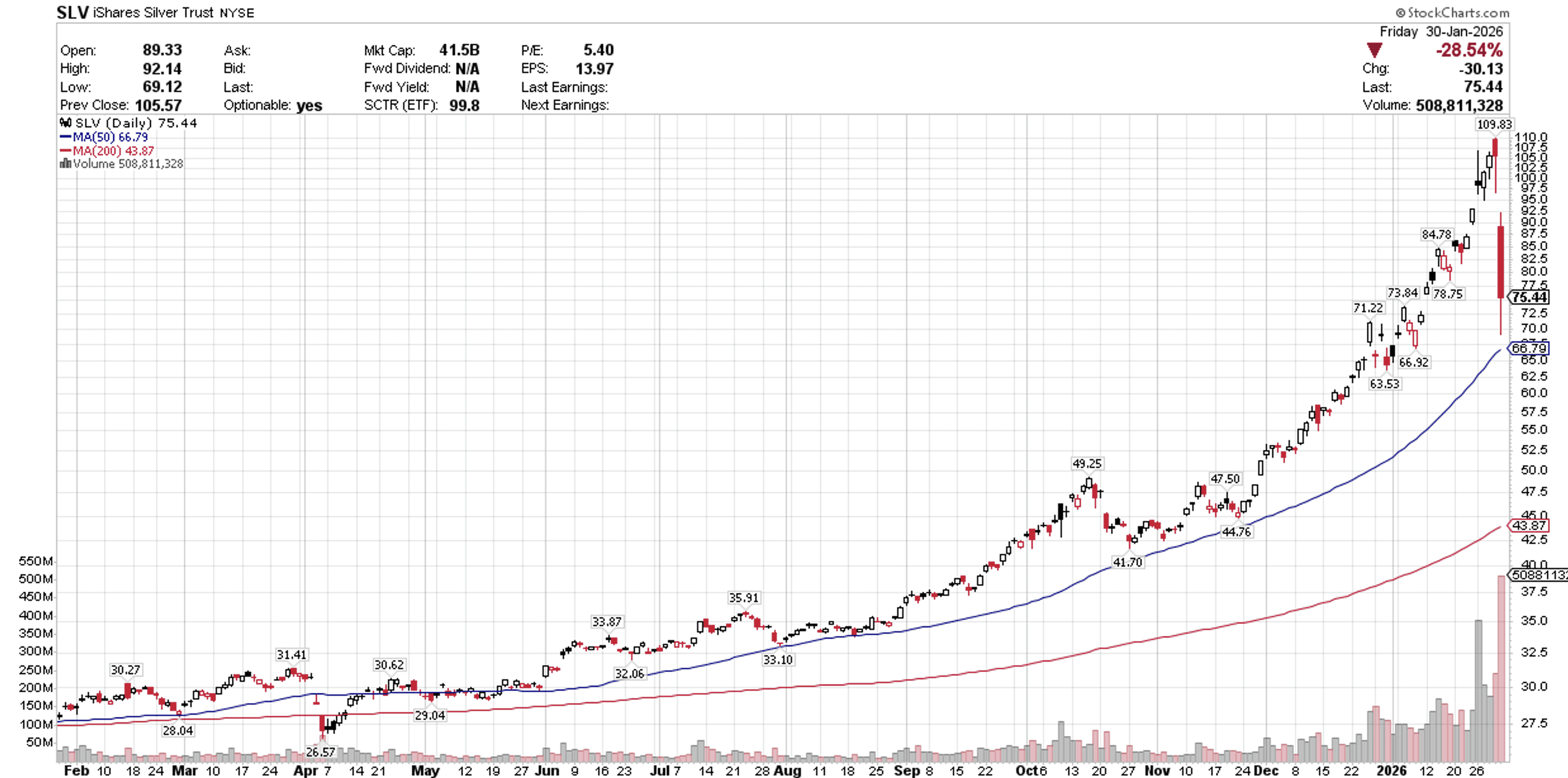 Two weeks ago, I discussed the dangers of chasing speculative momentum in precious metals, led by silver, sharing the chart below. The iShares Silver Trust (SLV) opened at $86.19 that Monday morning on its way to an all-time high of $105.57 last week. The more than 100% surge in price over the prior two months was rationalized with concerns about currency debasement, a weakening dollar, and increased industrial demand, but there was nothing rational about the move at all. I asserted that speculation by investors playing the momentum was the primary fuel for the parabolic move. As such, this game of musical chairs would not end well, as we ultimately learned on Friday when silver plunged some 30%. It was its largest single-day drop in history. Gold and silver have long been valuable components of a diversified investment strategy, because they were not correlated with risk assets, but when they started trading like meme stocks they no longer served that purpose and the writing was on the wall.
