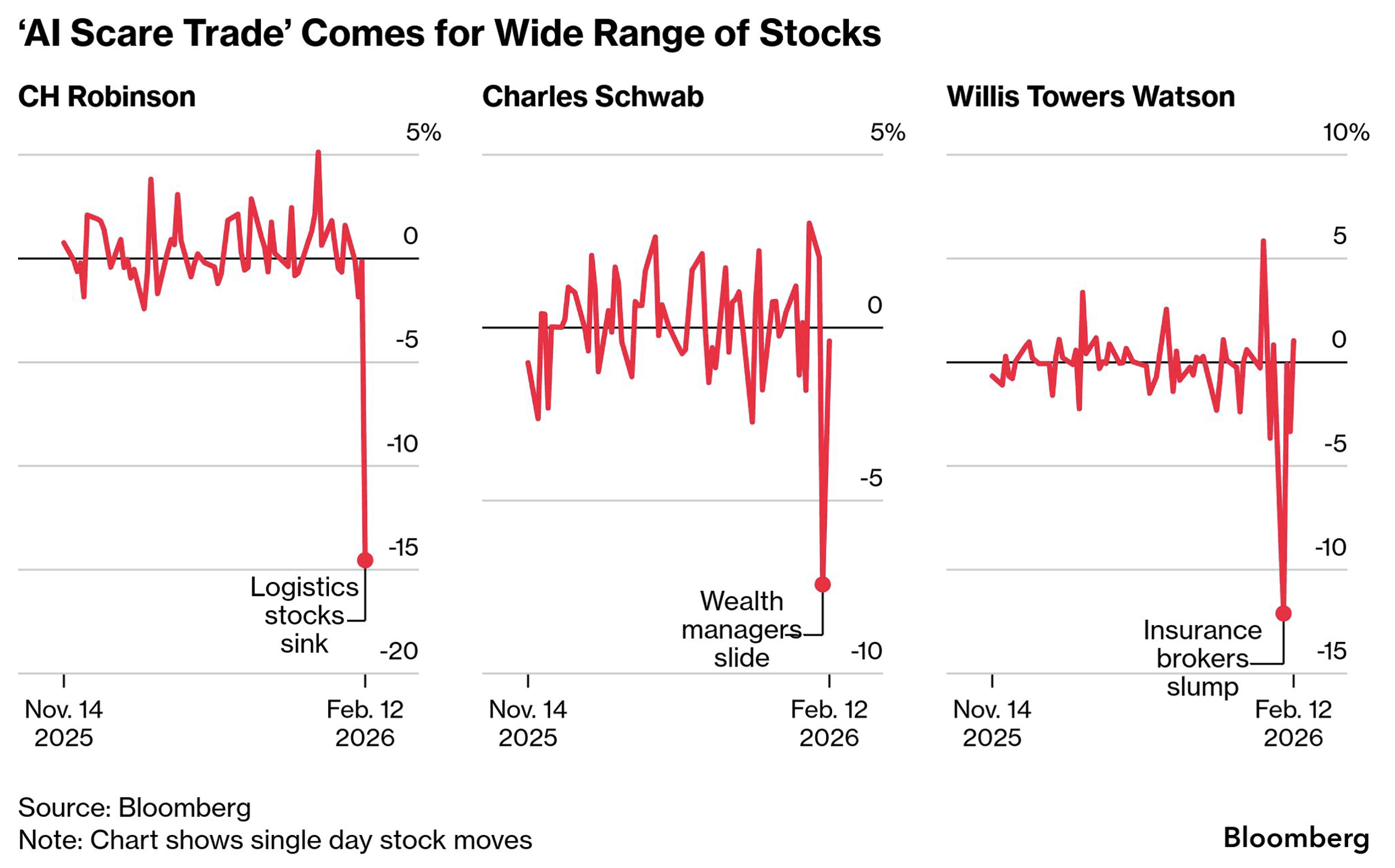 While the S&P 500 suffered its worst week since the pullback in November, the equally weighted version of the index continues to hover near all-time highs, as investors scale out of expensive growth stocks into other more cyclical and value oriented ones. This rotational correction is starting to impact companies outside of the technology sector whose business models are perceived to be at risk from new AI applications. After crippling the stocks of software companies whose workflows AI could potentially automate or replicate internally, investors now see risks in sectors like real estate, transportation and logistics, as well as finance. New tools from Anthropic are threatening publishing companies, while Altruist has a tax-strategy tool that could undermine some financial services. This adds a new dimension to the ongoing correction in growth stocks, which the bears assert poses a threat to the sustainability of the bull market.
